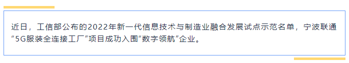 在集团公司新定位新战略下,下一步,宁波联通还将持续深化落实工信部5G应用“扬帆”行动计划,以“大联接、大计算、大数据、大应用、大安全”战略业务布局为顶层指引,全力探索工信部《5G全连接工厂建设指南》和十大重点行业20个典型应用场景,大力推进“5G﹢工业互联网”新技术、新场景、新模式向工业生产各领域各环节深度拓展,运用新一代信息技术赋能制造业,以行业龙头企业为引领,全力赋能中小企业数字化转型,推动纺织服装、新材料、汽车零部件等传统产业智能化发展,致力于加快推进5G融合创新从试点示范到规模复制,持续推动5G深耕、产业融合和价值释放。
