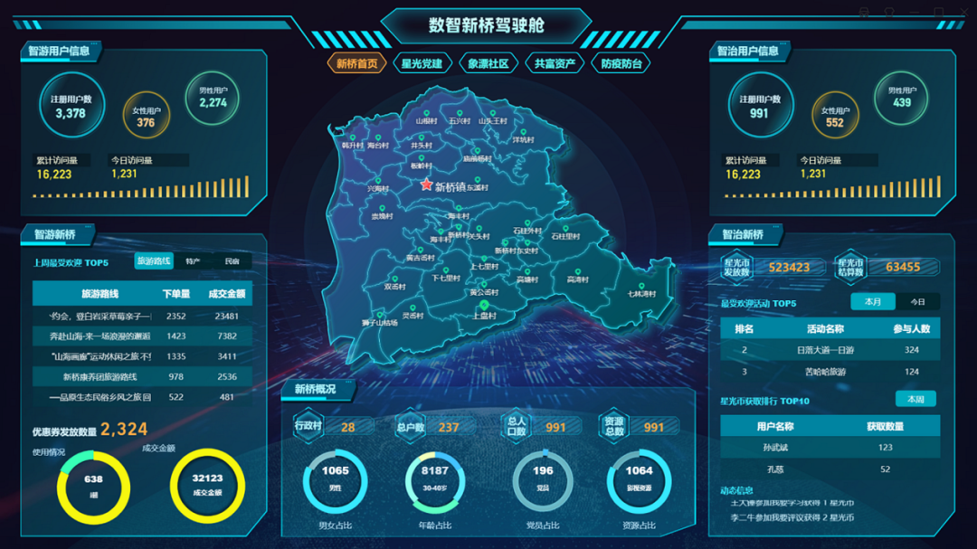 “数智新桥”平台成功上线后,村镇管理人员可通过平台加强日常监管能力,如:建立本地房源信息展示窗口;监管民宿入住登记等落实到位;借助数字大屏实时掌握游客流量动态;发布活动提高村民参与治理工作积极性,促进治理工作落地等。通过一体化的平台打造,新桥镇规避多平台、多入口、多应用的弊端,使基层治理精准到户,引入多维度积分评价体系来进行智治创新,真正实现一屏管资源、一码游新桥、小积分见大信用,实现利用数字化手段赋能乡村振兴,打造现代版滨海“富春山居图”的“共同富裕样板镇”。